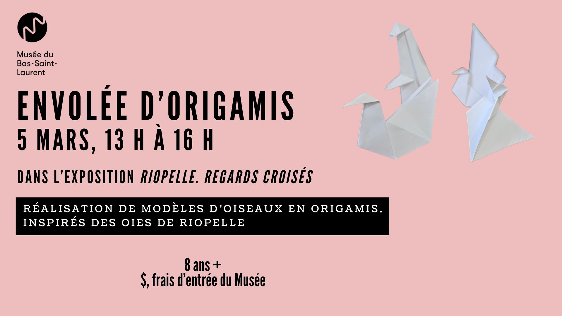 Notre équipe de médiation culturelle vous accompagnera à même la salle d’exposition Riopelle. Regards croisés pour vous aider dans la réalisation d’un ou plusieurs modèles d’oiseaux en origami.